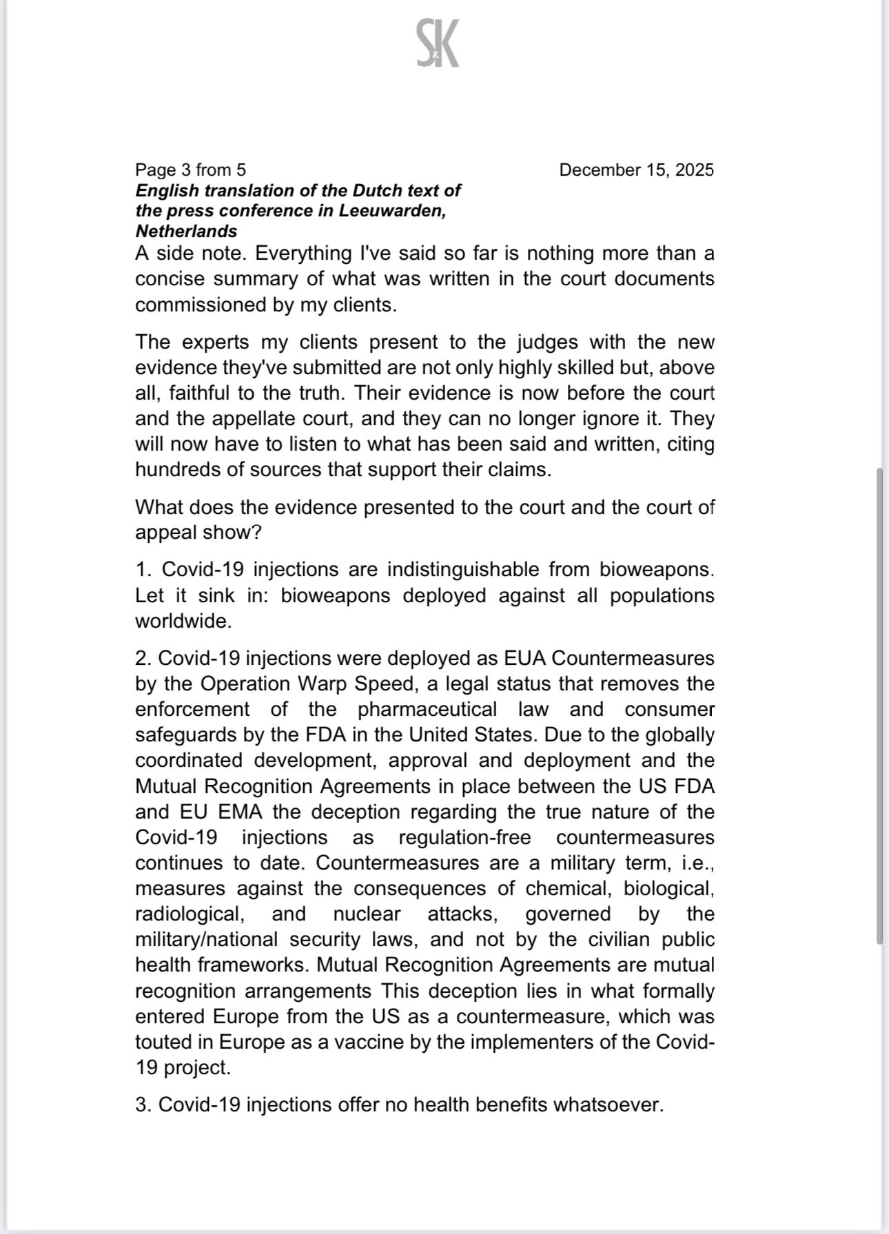 What happened is that we had a hearing [July 9, 2025] about evidence before. It was a hearing where there was a request to hear five experts, five, I think, of the best experts in the world such as Michael Yeadon and Sasha Latypova, Catherine Austin Fitts, Katherine Watt and Joseph Sansone. And they all are very much willing to let them hear, with their knowledge and evidence about the true, what is really true about the Covid 19 injections.