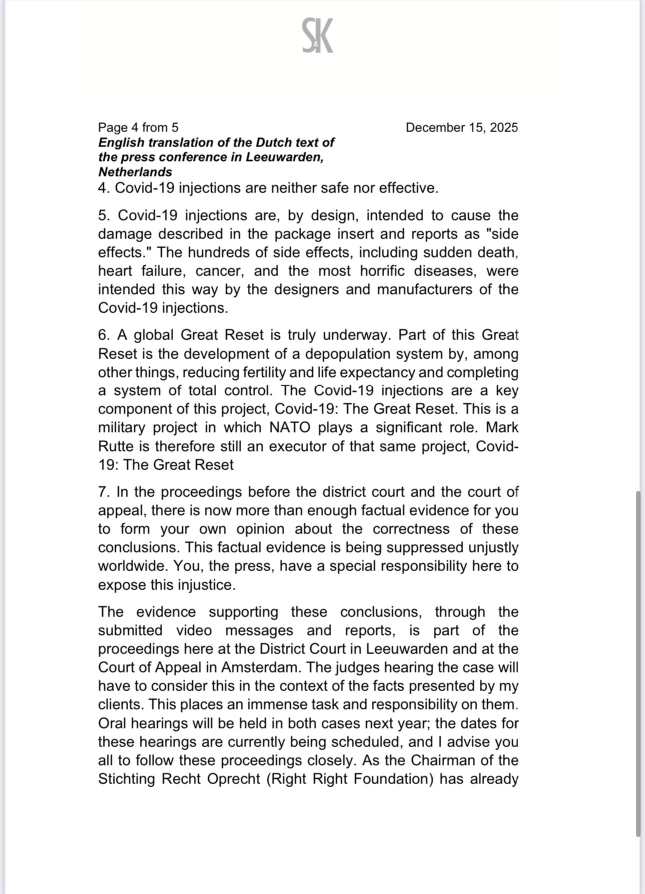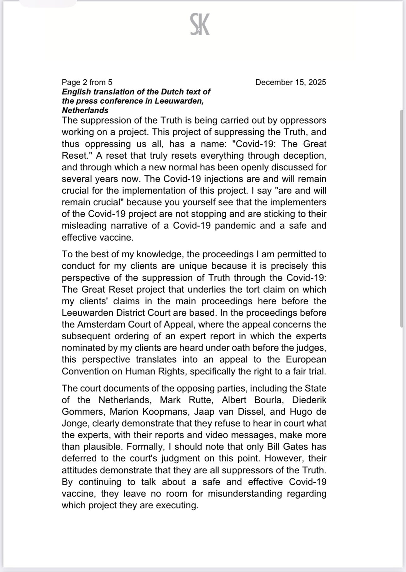 Then just technically, you started a case in 2023 together with Arno van Kessel that was for several people who were hurt by the gene therapeutic injections. Then there was an incident, I believe, where Mr. [Bill] Gates said
