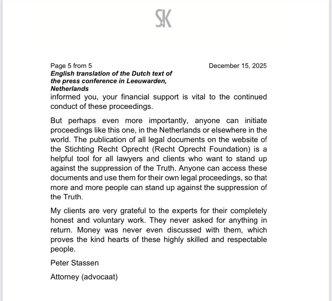 Transcript, interview of Attorney Peter Stassen by Djamila le Pair, Dec. 15, 2025, Leeuwarden NL
