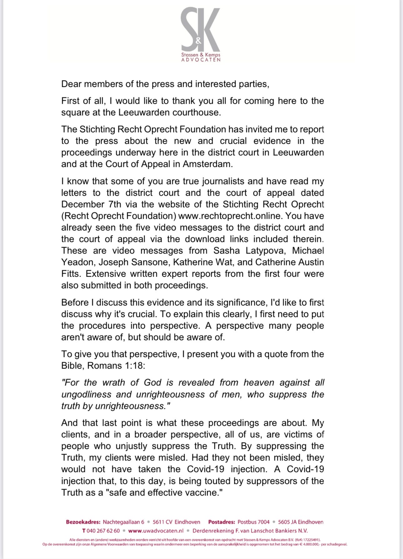 Meanwhile, lawyer Arno van Kessel has been imprisoned and Mr. Stassen is bravely going on with this procedure. You just had a press conference here to do with the evidence you submitted to the court on the 7th of December, I understand, and to invite everybody around the world to look at all the documents you have put on your website, also in English, to start court cases themselves.
